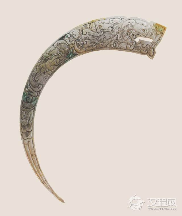 ▲战国 玉龙纹冲牙 高12.1cm,宽2.2cm,厚0.5cm 故宫博物院藏