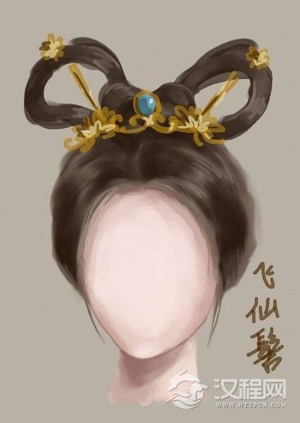 飞仙髻多是两侧结高鬟。据《炙毂子》记载:“汉武帝时,王母降,诸仙髻皆异人间,帝令宫中效之,号飞仙髻。”多用于仙女与未出室少女。