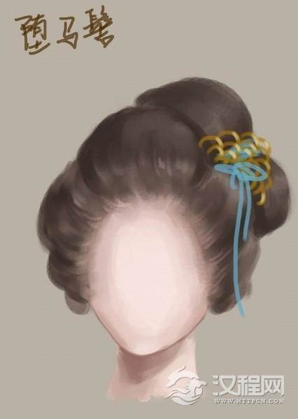 堕马髻其梳编法是将发拢结,挽结成大椎,在椎中处结丝绳,状如马肚,堕于头侧或脑后。《古今中华注》也记有“堕马髻惟倭堕髻,一云:堕马之余形也”。