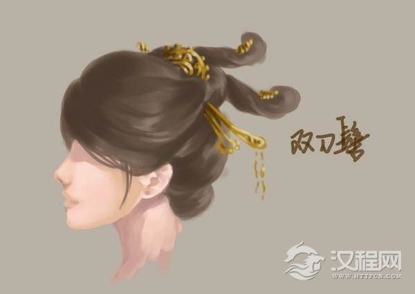 双刀髻其梳编法是将发往上拢结于顶,再反绾成双刀欲展之势。据《妆台记》记载:“唐武德中,宫中梳半翻髻。又梳反绾髻,贞元中梳归真髻,贴五色花子。”皆类似反绾式的发型。