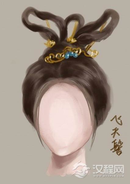 “飞天髻”则是结三鬟于顶,耸立直上。据《宋五行志》记载:“文帝元嘉六年,民间妇人结发者三分发,抽其鬟直上,谓之飞天。”古之“百花”发式亦属这种类型。