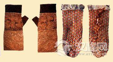 汉代妇女服饰实物 沙马王堆一号汉墓出土的实物中,服装的款式是典型的西域民族样式,但质料和纹样有汉族特点,还织着富有吉祥如意的汉字,是东汉时期各民族人民相互交融的产物。马王堆汉墓发掘出的实物资料异常丰富,尤其是服装,经历二千多年,质地仍然坚固,色泽依然鲜艳,反映出古代劳动人民的精湛技术和高超水平。从一号墓出土的服饰有素纱禅衣、素绢丝绵袍、朱罗纱绵袍、绣花丝绵袍、黄地素缘绣花袍、絳绢裙、素绢裙、素绢袜、丝履、丝巾、绢手套等几十种之多。颜色有茶色、絳红、灰、朱、黄棕、棕、浅黄、青、绿、白等。花纹的制作技术有织、绣、绘。纹样有各种动物、云纹、卷草及几何纹等。其中最使人感到惊奇的是这种素纱禅衣,整件服装,薄如蝉翼,轻如烟雾,衣长128厘米,两袖通长190厘米,在领边和袖边还镶着5.6厘米宽的夹层绢缘,但全部重量只有48克,还不到一两,是一件极为罕见的稀世之品。本图为“信期绣”绢手套(湖南长沙马王堆一号汉墓出土实物)及菱纹“阳”字锦袜(新疆民丰东汉墓出土实物)。