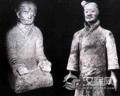 秦汉男女服饰 左图穿窄袖袍服的秦代妇女(陕西临潼近郊出土陶俑)。右图穿窄袖袍服的秦代男子(陕西临潼出土陶俑)。从这两件陶俑的服饰来看,秦代男女日常生活中的服饰形制差别不大,都是大襟窄袖,不同之处是男子的腰间系有革带,带端装有带钩;而妇女腰间只以丝带系扎。