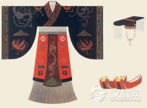 秦汉服饰 汉代皇帝冕服图、冕冠图、赤舄图(参考文字记载及山东济南汉墓出土陶俑、沂南汉墓出土画像石复原绘制)。本图根据文献记载及图案资料复原绘制,服装上的纹样大多采用同时期的砖画、漆画、帛画及画像砖等。冕冠,是古代帝王臣僚参加祭祀典礼时所戴礼冠。用作皇帝、公侯等所穿的祭服。冕冠的顶部,有一块前圆后方的长方形冕板,冕板前后垂有“冕旒”。
