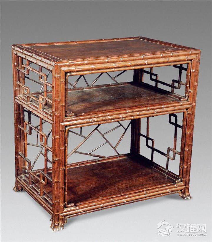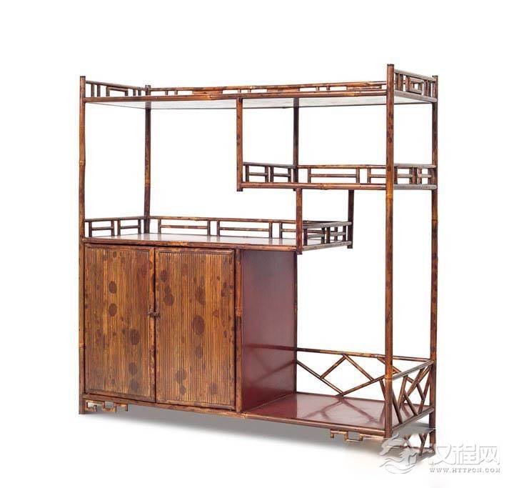 此款湘妃竹茶棚色泽古朴甜润,整体看似复杂但却简洁明快,即具体而又多变的空间利用,可将茶器主人之收藏,作具体而完美的体现,更显爱茗之人之雅好。