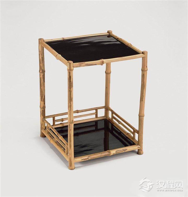 赏析:茶棚是茶道中盛放茶具的小架,此方形茶棚取紫竹节榫卯穿插成器。结构合理,十分精致。板面黑漆髹制,光滑明亮。