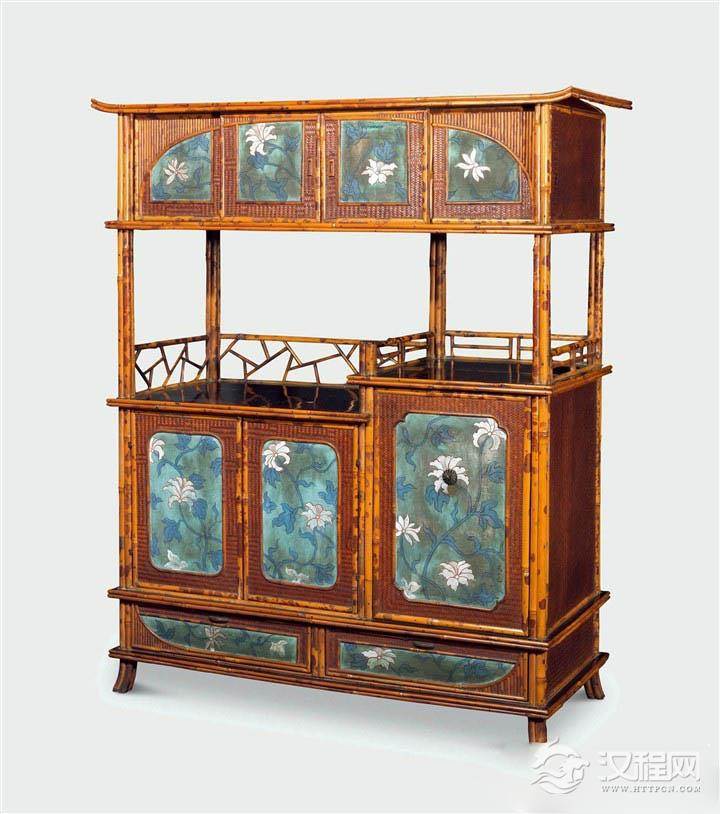说明:日式茶棚是茶道艺术中不可缺少的家具,因茶道不少都源于中国的茶艺,其家具也颇有相似之处。此件茶棚以湘妃竹拼攒而成,架构稳固,体态轻盈,茶棚的侧面以竹丝编制而成,面板和底部髹以黑漆,光洁沉稳,尤其在茶棚所有的面板上,彩绘以颇有中式风格的折枝荷花纹,色彩明快,搭配妥帖,围栏以冰梅纹拼攒,再续中式风格。整件茶棚无不体现了日式的精致和中式的清雅,十分得体。