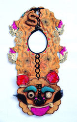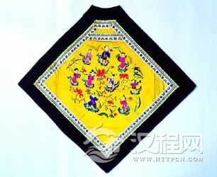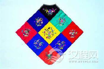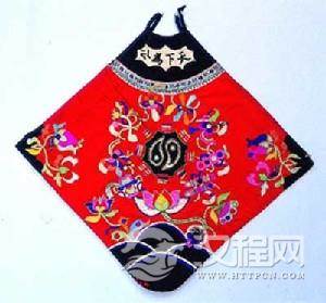 也称“兜肚”以正方或菱形的衣片,有素色和刺绣纹样之分,贴身护在胸乳腹部位,有束带套于后颈,左右两角装有绳带,系于后背,还有有袋无袋之分,袋中通常装有姜桂及麝香等药物,用作治腹部冷痛虚寒。