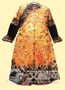本图为清末宣统淑妃文秀大婚用金黄地绸绣朝袍。