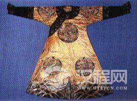 本图为内蒙古荣宪公主墓出土清代荣宪公主黄缎穿珠绣八团龙有水女袍。