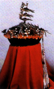 清代皇后的朝服由朝冠、朝袍、朝褂、朝裙及朝珠等组成。朝冠,冬用薰貂,夏用青绒,上缀有红色帽纬。顶部分三层,叠三层金凤,金凤之间各贯东珠一只。帽纬上有金凤和宝珠。冠后饰金翟一只,翟尾垂五行珍珠,共三百二十颗,每行另饰青金石、东珠等宝石,末端还缀有珊瑚。(传世实物)