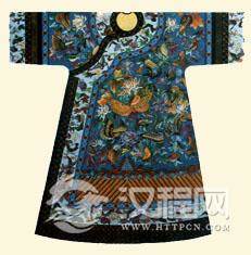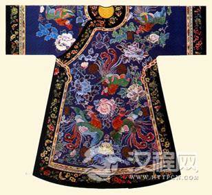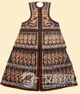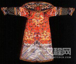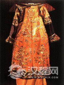 清代皇后缂丝龙袍,清代女龙袍为圆领、右衽、大襟、左右开气、袖有袖身、接袖、综袖、马蹄袖端的明黄色的长袍。领与接袖、中接袖、袖端为石青色。纹样有三种类型:第一类为饰金龙九条,间以五色云纹及福、寿纹,下幅饰八宝立水,领托前后正龙各一条,左右及交襟处饰行龙各一条,袖相接处饰行龙各二条。绵、夹、裘根据季节而定。皇贵妃龙袍与此相同为黄色,贵妃及妃龙袍用金黄色,嫔龙袍为香色。第二类为织绣五爪金拢八团,两肩、前胸、后背饰正龙各一条。襟饰行龙四条。下幅饰八宝立水,其它与第一类龙袍相同。第三类为下幅无纹样,其它与第二类龙袍相同。本图为内蒙古荣宪公主墓出土清代荣宪公主黄缎穿珠绣八团龙有水女袍。本图为清代乾隆二世皇后缂丝龙袍。