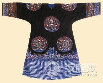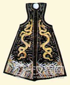 清代后妃服饰,清代龙褂,样式为圆领、对襟、左右开气、袖端平直的长袍。龙褂只能为皇后、皇太后、皇贵妃、贵妃、妃、嫔服用。皇后龙褂纹饰,据文献记载有两种类型,北京故宫所藏实物,则有三种类型,均为石青色:第一种饰五爪龙八团,两肩、前胸后背各一团为正龙,前后襟行龙各两团,下幅八宝、寿山水浪江涯及立水纹,袖端各两条行龙及水浪纹。第二种只饰五爪金龙八团,下幅及袖端不施纹样。第三种饰五爪金龙八团,下幅加水浪江涯、寿山、立水纹。皇后、皇太后、皇贵妃、贵妃、妃龙褂与此相同。嫔所穿龙褂,两肩前后正龙各一条,襟变四龙。此图为清代光绪皇后石青缎地五彩绣缉米珠云龙八团,有水龙褂,即为第一种。