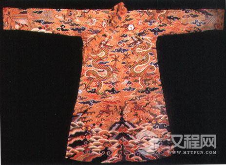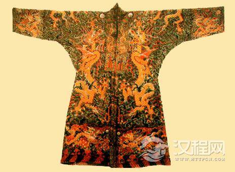 明代皇帝服饰龙袍,明朝建立以后,废弃了元朝的服制,并根据汉族人民的习俗,将服饰制度重新规定。首先制定皇帝的礼服。皇帝服饰有冕服、通天冠、皮弁服(弁为男子戴的一种帽子)、武弁服、常服等。同时还制定出后妃的礼服、常服,文武官员的常服基建士庶巾服。此图为织金缎龙袍,是山东邹县明鲁王朱檀墓出土的柿蒂膝襕五爪行龙袍,亦称“腰线”或“曳撤”。