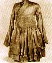 明万历有翼三眼龙、对襟、窄袖藏式洒线绣龙袍(出土实物),袍料立水部分已剪短。
