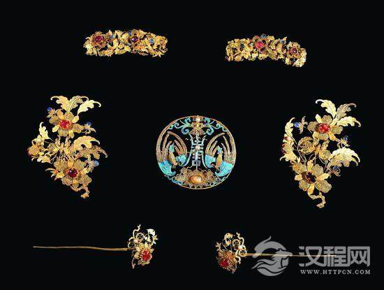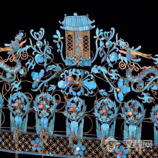 它的制作工艺极为繁杂,制作时先将金、银片按花形制作成一个底托,再用金丝沿着图案花形的边缘焊个槽,在中间部分涂上适量的胶水,将翠鸟的羽毛巧妙地粘贴在金银制成的金属底托上,形成吉祥精美的图案。这些图案上一般还会镶嵌珍珠、翡翠、红珊瑚、玛瑙等宝玉石,越发显得典雅而高贵。