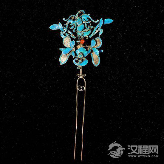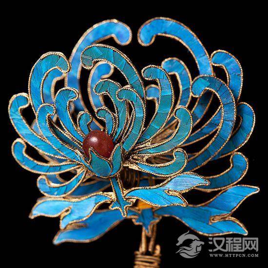 翠鸟毛光泽好颜色鲜亮,再配上金光闪闪的凸边,衬托古代仕女乌黑如云的绣发,犹如幽幽湖水上点点灵动的浮光魅影。然而翠鸟娇小,羽毛柔细,即使制一朵精巧的头花却要牺牲许多美妙的小生灵,因此后世出现了多种仿点翠的饰品。