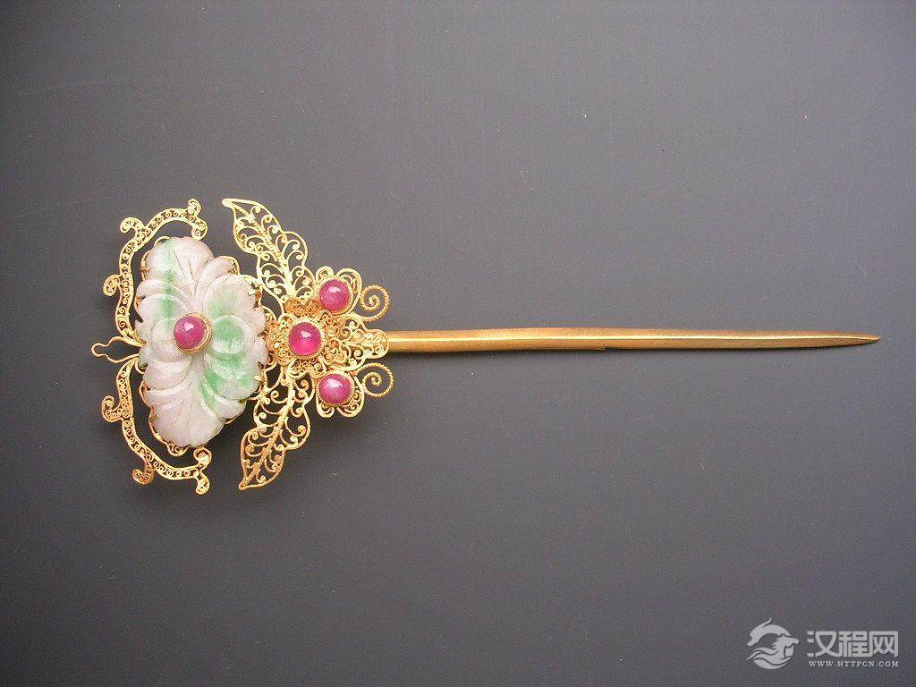 簪是由笄发展而的,是古人用来绾定发髻或冠的长针。可用金属,骨头,玉石等制成。后来专指妇女绾髻的首饰。擿,簪股,将头部做成可搔头的簪子,所以俗称为搔头。《西京杂记》记载:汉武帝过李夫人,就取玉簪搔头,自此后宫人搔头皆用玉簪。《后汉书·舆服志》有:“黄金龙首衔白珠,鱼须擿,长一尺,为簪珥。”的记载。钗,由两股簪子交叉组合成的一种首饰。用来绾住头发,也有用它把帽子别在头发上。五代五缟《中华古今注·钗子》:“钗子,盖古笄之遗象也,至秦穆公以象牙为之,敬王以玳瑁为之,始皇又金银作凤头,以玳瑁为脚,号曰凤钗。”钗与簪是有区别的,发簪作成一股,而发钗一般作成两股。华胜,即花胜。古代妇女的一种花形首饰,通常制成花草的形状插于髻上或缀于额前。《释名·释首饰》:“华胜,华,象草木之华也;胜,言人形容正等,一人著之则胜,蔽发前为饰也。”《汉书·司马相如传下》:“暠然白首戴胜而穴处兮。”唐颜师古注;“胜,妇人之首饰也,汉代谓之华胜。”