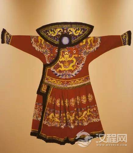 「嘉庆·大红色缎绣彩云金龙夹朝袍」