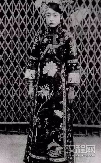 此款氅衣为清末的典型款式,与传统氅衣不同之处在于,衣身变窄,更加合体,在圆领上加装了立领,已开始向近代旗袍过渡。下图为婉容着与此款相同氅衣旧照。