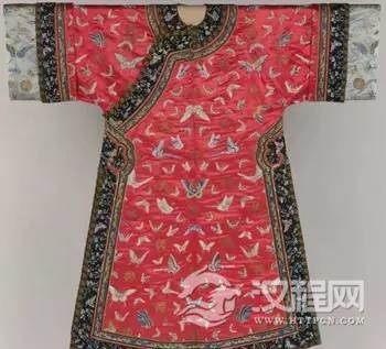 此衣为红色缎地,衣身及镶边、挽袖均绣制相同图案的蝴蝶花卉纹。此衣色彩艳丽,构图饱满,应为年轻女子在喜庆日子所穿。