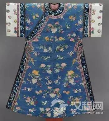 清代蓝色地宝瓶四季花卉纹缂丝氅衣