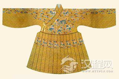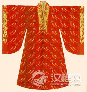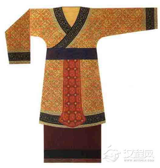 绣罗单衣及刺绣纹样(湖北江陵马砖一号楚墓出土实物)。楚墓出土的战国中期服饰实物,有绢、罗、锦、纱、绦等各种衣着十余件,为目前所见的最早的实物。从实物来看,锦袍和禅衣样式基本相同,即前身、后身及两袖各为一片,每片宽度与衣料本身的幅度大体相等。右衽、交领、直裾。衣身、袖子及下摆等部位均平直。领、袖、襟、裾均有一道缘边,袖端缘边较为奇特,通常用两种颜色的彩条纹锦镶沿。