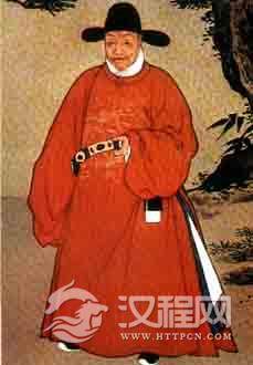 明代文武官员服饰主要有朝服、祭服、公服、常服赐服等。麒麟袍为官吏的朝服。其服装特点是大襟、斜领、袖子宽松,前襟的腰际横有一带,下打满裥。所绣纹样,除胸前、后背两组之外,还分布在肩袖的上端及腰下(一横条)。另在左右肋下,各缝一条本色制成的宽边,当时称“摆”。 明代太监刘若愚《酌中志》一书,就专门叙述到这种服饰。他说:“其制后襟不断,而两旁有摆,前襟两截,而下有马面褶,从两旁起。”这种服装所采用的质料和纹样,按规定,都有一定制度。《明史·舆服志》称:正德十三年,“赐群臣大红贮丝罗纱各一。其服色,一品斗牛,二品飞鱼,三品蟒,四、五品麒麟,六、七品虎、彪;翰林科道不限品级皆与焉;惟部曹五品下不与。”本图所绘的服装,就绣有麒麟纹样。麒麟是古代传说中的一种动物,形状象鹿,全身有鳞甲,牛尾马蹄,有一只肉角。后人将它作为吉祥的象征广泛用于各类器物的装饰。麒麟的形象也经过一番变化,将头绘成龙首并有两角,尾绘成狮尾等等。明代官服绣麒麟,似不限四、五品,职位特殊的锦衣卫指挥侍卫等也能服用。