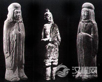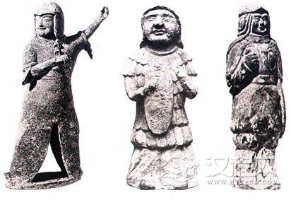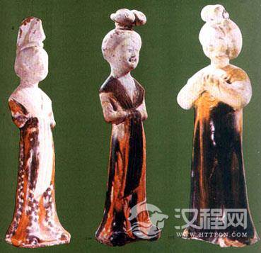 左图为戴突骑帽、披小袖衫子的官吏(北朝陶俑)。中图为戴突骑帽、穿裤褶、袒右臂的男子。右图为戴突骑帽、穿大袖衫的官吏(河北磁县北白道出土彩绘陶俑)。 魏晋帽类有几种样式:一种“白高帽”,“其制不定,或有卷荷,或有下裙,或有纱高屋,或有乌纱长耳”;一种“突骑帽”,“如今胡帽,垂裙覆带,盖索发之遗象也”。 魏晋时期一般男子服饰主要为大袖衫、胯褶及两裆等。男子一般都穿大袖翩翩的衫子,直到南朝时期,这种衫子仍为各阶层男子所爱好,成为一时的风尚。图中官吏外穿的服装,形似披风,两边虽装有袖子,但无实际用途。