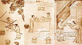 明代平民男子一般服饰为搭护(属于半臂一类的衣服)、直身(与道袍相似的宽大长衣)、程子衣、裤褶、裙等。妇女的服饰,随随各人的家境及身份的变化,有各种不同形制,普通妇女服饰比较朴实,主要有襦裙、背子、袄衫云肩及袍服等。袍服是由背子演变而来,特点为低领、对襟、宽袖,领、袖花边较少或不用,衣长及足。左图为戴网巾或笠帽的农民(明崇祯十年刻本《天工开物》插图)。中图为梳髻、穿对襟衫的农妇(明崇祯十年刻本《天工开物》插图)。右图为裹巾、穿窄袖衫的男子及穿襦裙的妇女(明万历年间刻本《人镜阳秋》插图)。
