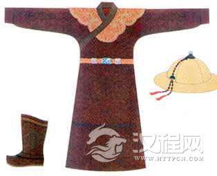 图为窄袖织龙纹锦袍、瓦楞帽、云肩、缎靴展示图。元代贵族袭汉族制度,在服装上广织龙纹。据《圆史舆服志》记载,皇帝祭祀用衮服、蔽膝、玉簪、革带、绶环等有饰有各种龙纹,仅衮一件就有八条龙,领袖衣边的小龙还不计。龙的图案是汉族人民创造的,它代表着华夏民族的文化。晚唐五代以后,北方少数民族相继建立政权,都无例外地沿用了这一图案。到了元代更加突出,除服饰大量用龙之外,在其它生活器具中也广泛使用。元代蒙古族男子,戴一种用藤篾做的“瓦楞帽”,有方圆两种样式,顶中装饰有珠宝。