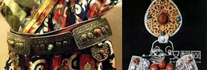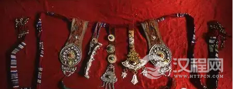 除藏刀外,有些妇女腰带上还系有精致的装针筒。为引火方便,还系有火镰夹,内装有火石和引火的绒艾,必备的是钱包和各种精美的奶钩。藏族同胞和门巴族同胞的服饰上多戴佛珠,依靠丰富的矿产资源,他们腰间挂有银饰和铜饰的品种形式繁多,走动时也会发出有节奏的声响。