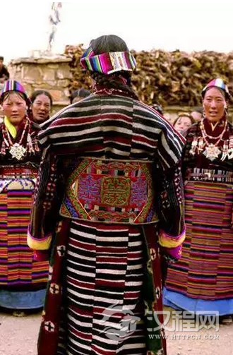 山南措美县扎扎乡妇女的腰带服饰中还有仿汉堆绣寿字的护腰装饰,说来还与当年文成公主有关。传说当年文成公主住在山南的昌都寺,一次反穿着衣服来到扎扎村,村里妇女见后竟然非常喜欢她的装束,便学着仿制。于是至今这个村子的妇女服装都有正反两面可穿,平时生活中黑色面向外,节日喜庆时彩色条纹一面向外。她们腰带的装饰也因此保留了寿字纹饰。