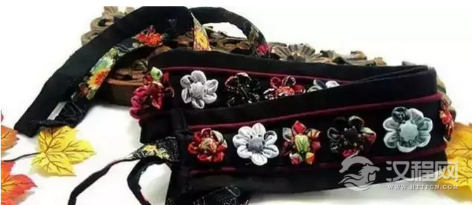 有些妇女腰带也用优质牛皮制成,两头窄中间宽,中间宽约四指,两头约两指。底面用呢、织锦缎或平纹布,带面镶红,然后用脱毛的各种染色羊皮精细裁雕,左右对称的花纹图案,用同色的丝线细密均匀地缝于底面,色彩相间,十分精致。