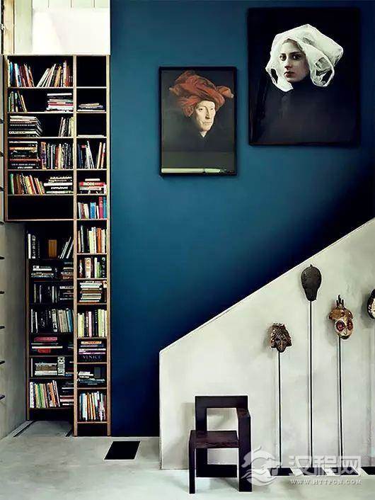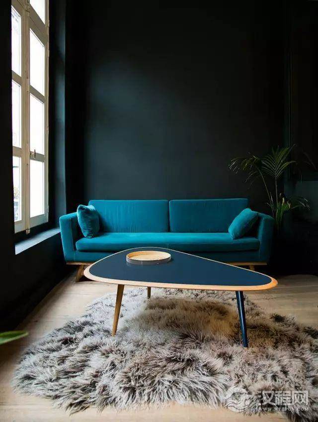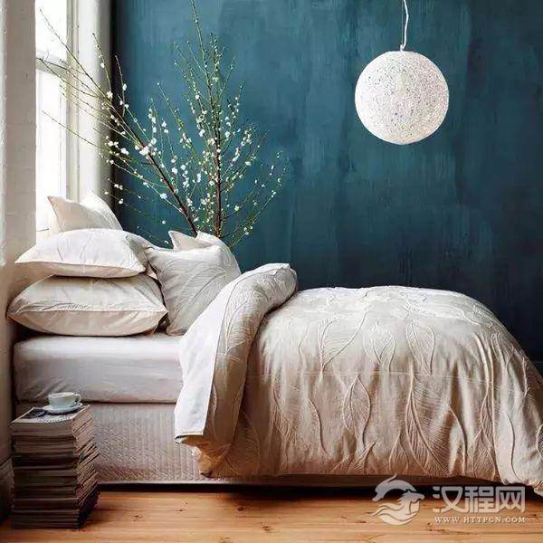 孔雀蓝的墙面作为背景,很好地使整个空间沉寂下来。在家装中,这样的背景色更有利于人们休息。