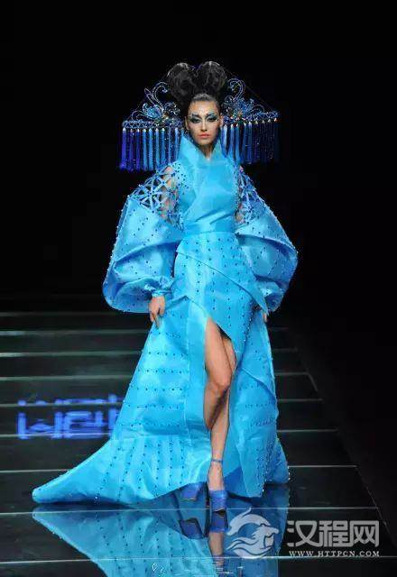 ▲仿唐式的礼服及头饰,配以孔雀蓝的色彩,典雅又不失时尚,散发着浓浓的东方韵味。