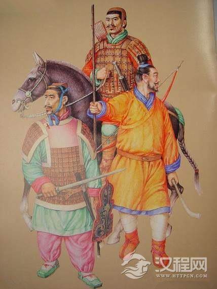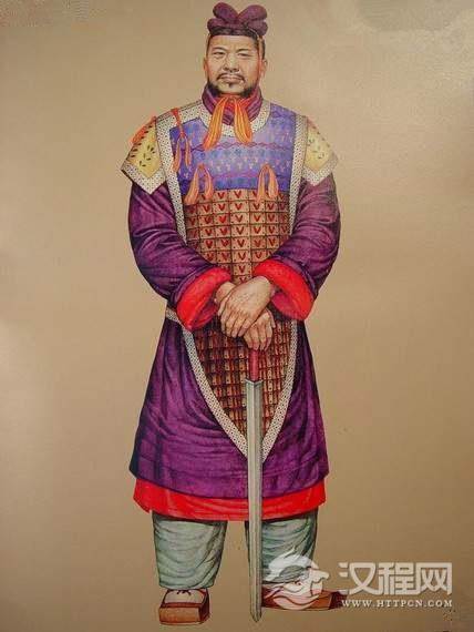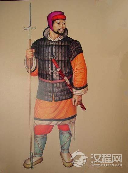 4、秦代(前221年-前207年)將軍服飾復原圖。 秦代的戎服,上自將軍下至士卒形制全部相同,一律上穿深衣,下穿小口褲,士卒腿上裹有行纏,足穿靴或履。兵的首飾有四類:第一類為幘,有兩種,一種為騎兵,一種為軍吏的。第二類是冠,為騎兵所戴。第三類為帽。第四類是髮髻。