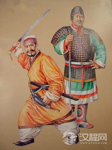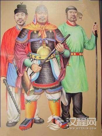 9、南北朝武士復原圖。 南北朝時期(420年-589年)的戎服很具特色,不僅樣式多,融合了多民族的服飾,而且因武官制度進一步完善,官兵在服飾上有了更明顯的區別。