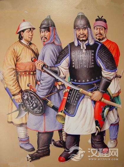 15、西夏(1038年-1227年)武士復原圖。西夏武士所穿鎧甲為全身披掛,盔、披膊與宋代完全相同,身甲好象兩襠甲,長及膝上,還是以短甲為主說明鎧甲的製造畢竟比中原地區落後一些。