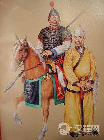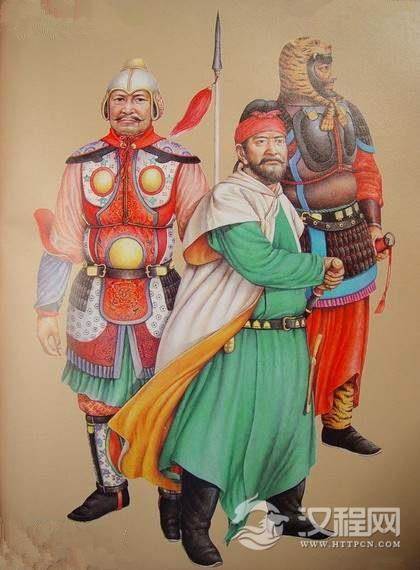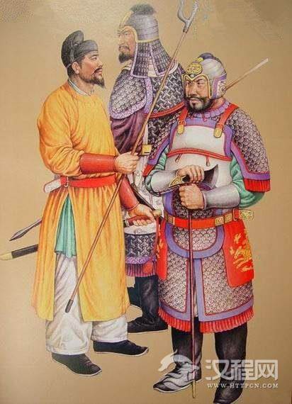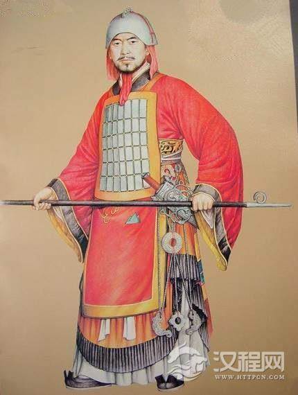 6、漢代(前202年-220年)將帥服飾復原圖。漢代的戎服在整體上有多方面與秦代相似,軍隊中不分尊卑都上穿禪衣,下穿褲。禪衣為深衣,又稱沙轂禪衣(即有縐紋的單衣)。漢代軍人的冠飾基本上是平巾幘外罩武冠。