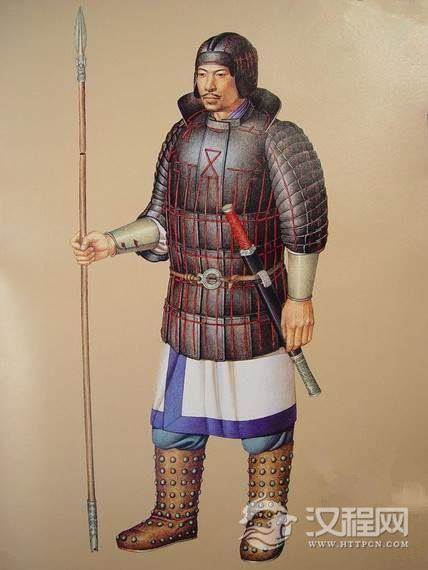 3、東周(春秋戰國)(前770年-前221)武士復原圖。春秋戰國除大量使用皮甲胄外,也使用青銅鎧甲。戰國後期,出現了鐵制鎧。