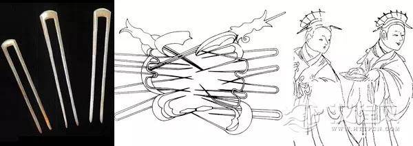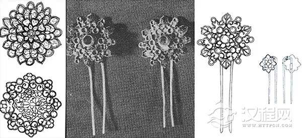 左:初唐盛唐墓葬出土花钗首或花钿 中:吴王妃墓出土花钗 右:出土小花钗