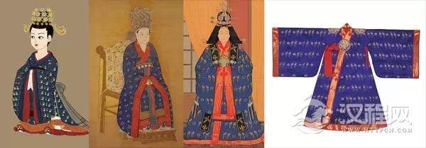 左:唐代袆衣推定图 宋宁宗袆衣坐像 右:“大韩帝国”英王妃翟衣实物