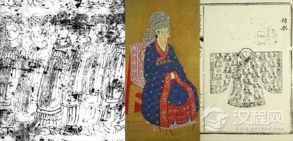 左:初唐李寿墓命妇礼服 中:北宋神宗后袆衣像 右:《大明集礼》袆衣图