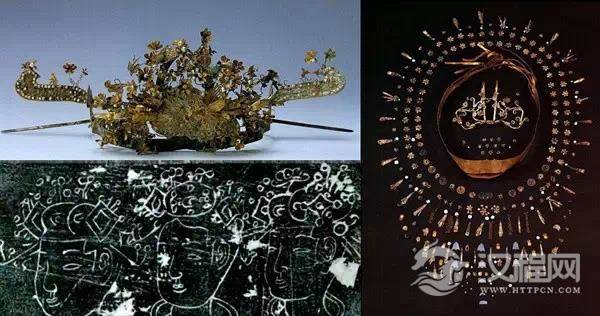 左:出土北朝至初唐金冠饰、初唐李寿墓命妇礼服线刻 右:初唐贺若氏墓出土冠饰