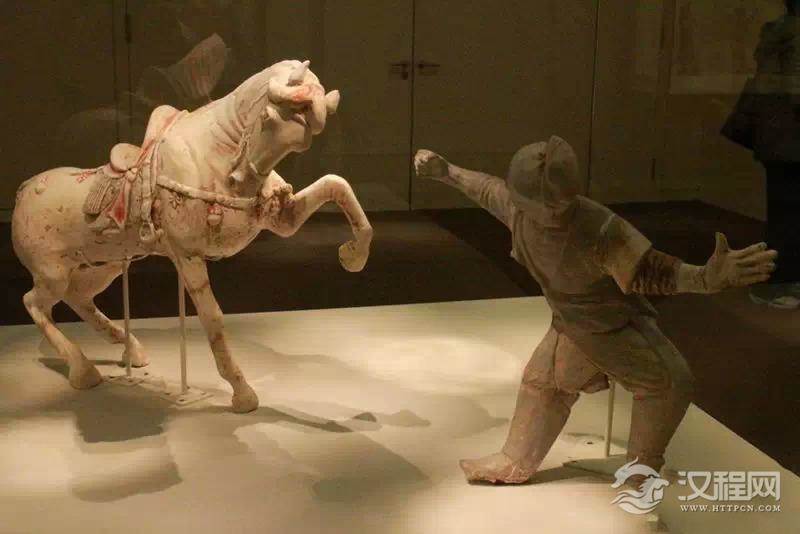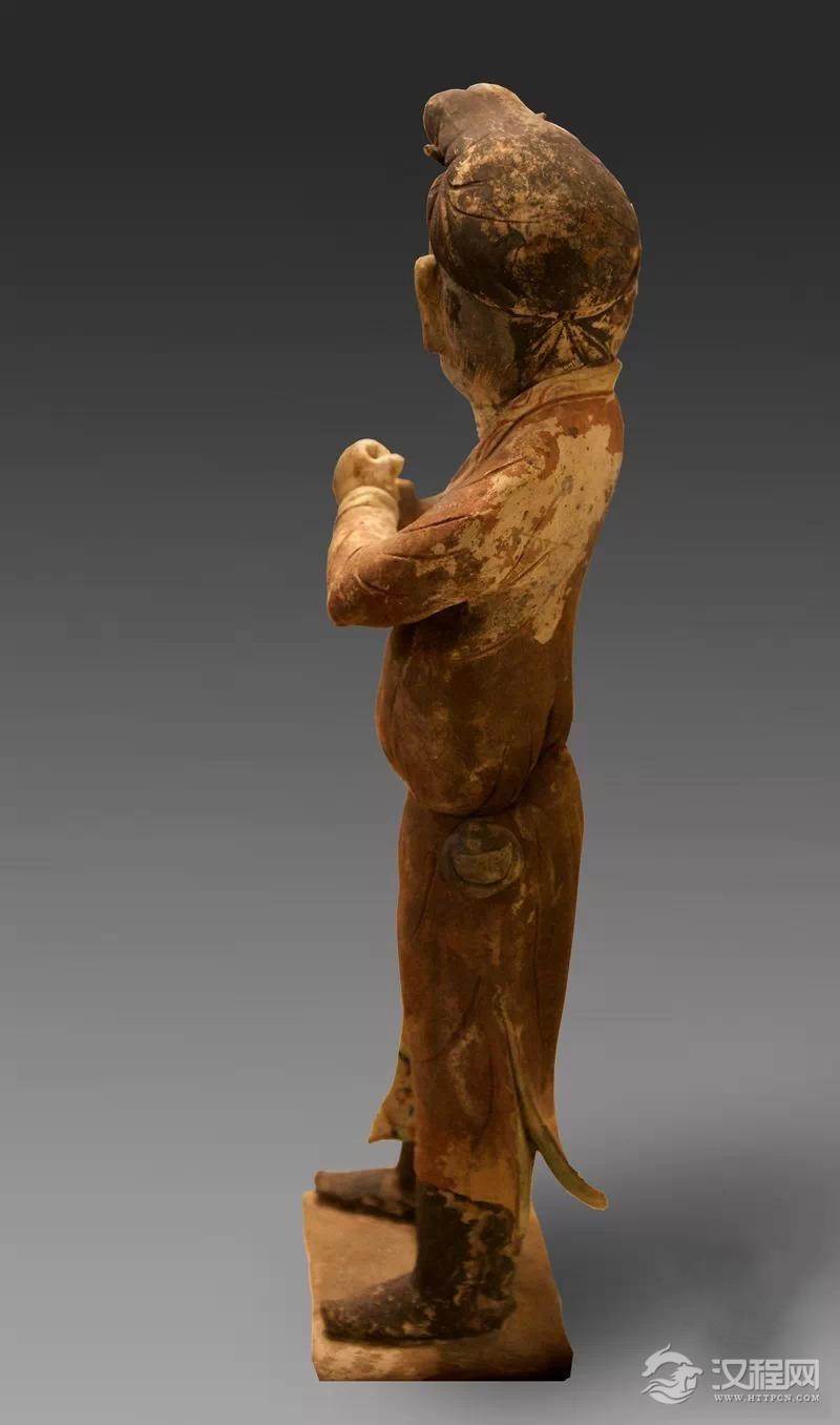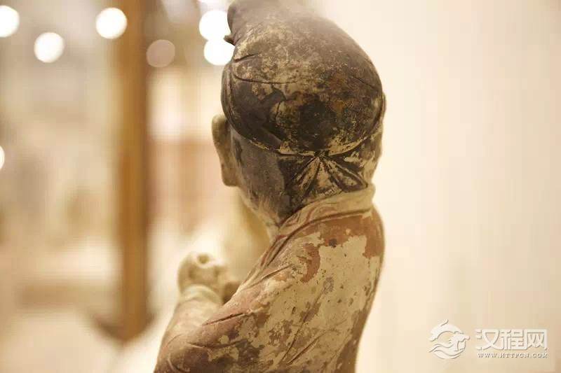 在“丝绸之路”文物展中同样戴幞头的还有甘肃庆城县赵子沟村穆泰墓出土的彩绘驯马陶俑。该陶俑中的马身体后坐,不肯前行,驯马者右臂拉扯缰绳,筋腱鼓起,富有力感。驯马者上身穿半臂,下身穿胫衣。胫衣的上端呈带状,上束于腰带上。下部有一个蹬腿环带,套于足底部。其裤腿上部有长带,将其系于膝盖下部,上沿呈内低外高形态,与人体大腿根部形态吻合,与阿城金墓出土的黄地小杂花金锦夹吊敦实物相互印证。