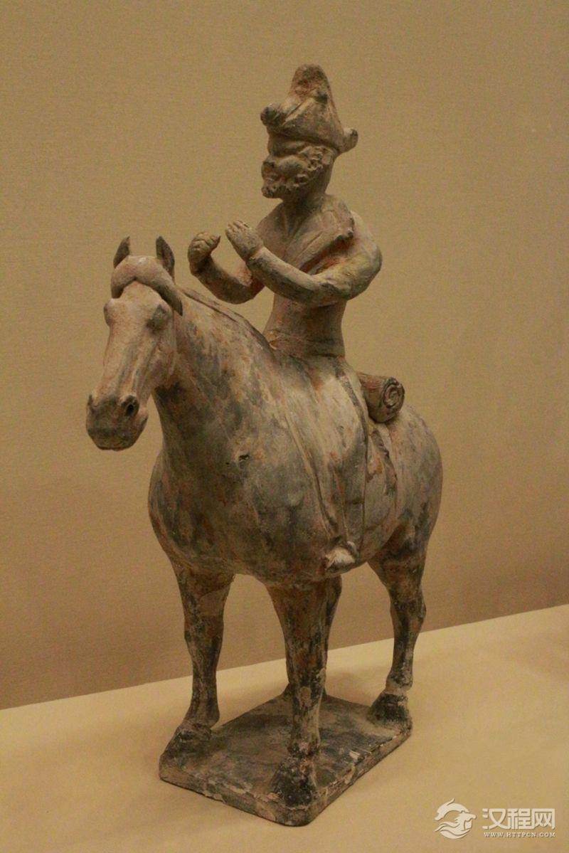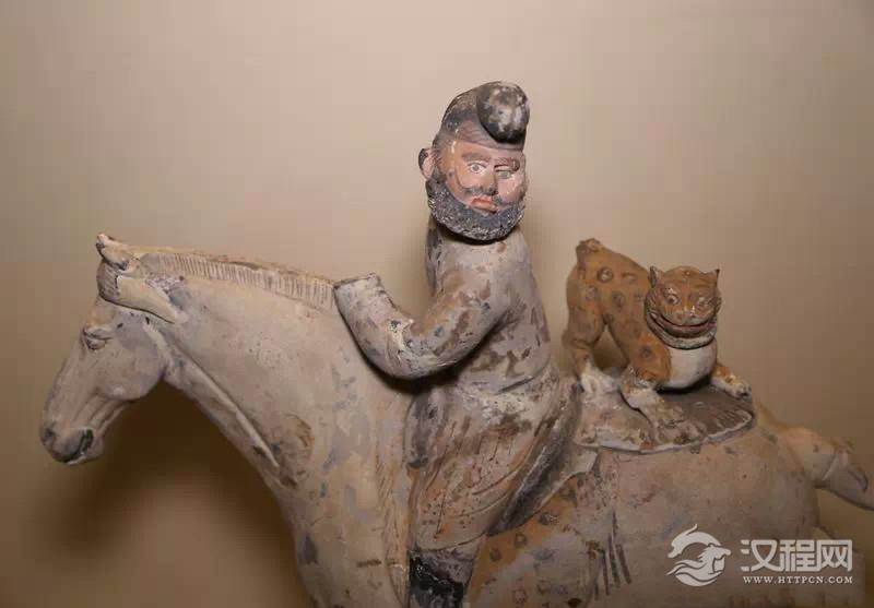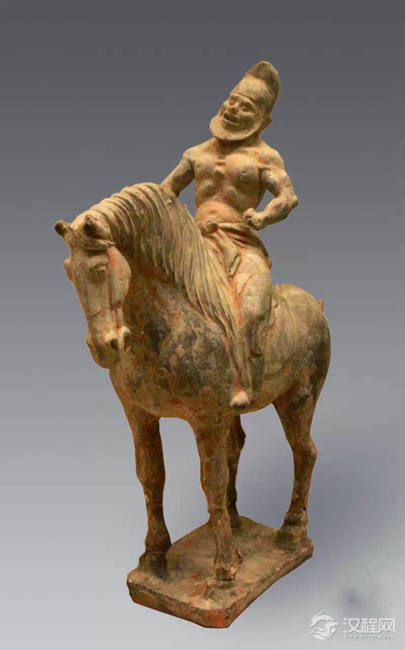 与彩绘豹纹裤陶胡人俑一样具有诙谐幽默气质的是甘肃省庆城县赵子沟村穆泰墓出土彩绘陶袒腹胡人俑。该胡人俑头后仰,胡须翘,瞪如牛眼,两个胳膊自身后向前曲伸,袒胸露腹,肚大腰圆,胸毛都写实地描画出来,应该是正在表演“手彩类”魔术。这类的袒胸形象在唐代陶塑中并不少见,更有甚者,1960年乾县永泰公主墓还出土过一件彩绘袒身的胡人骑马俑,高31厘米,马长22.5厘米。骑马俑瞪目张口,高鼻短须,上身袒露,下着长裤。前胸、臂、膊等处肌肉格外健美,是一位气度轩昂体魄雄健的勇夫形象。最让人瞩目的就是这身“腱子肉”,满都是力量美,而这件半裸的陶俑竟然出土于一位盛唐十几岁小公主的墓中,当时的民风可见一斑了。永泰公主墓还出土了一件彩绘胡人骑马载物俑,通高32厘米,马长26厘米。骑马俑头戴毡胡帽,帽的前后各有一圆形结,左手扬起,似在牵着马的缰绳,身后带着行李卷,好像准备出行。