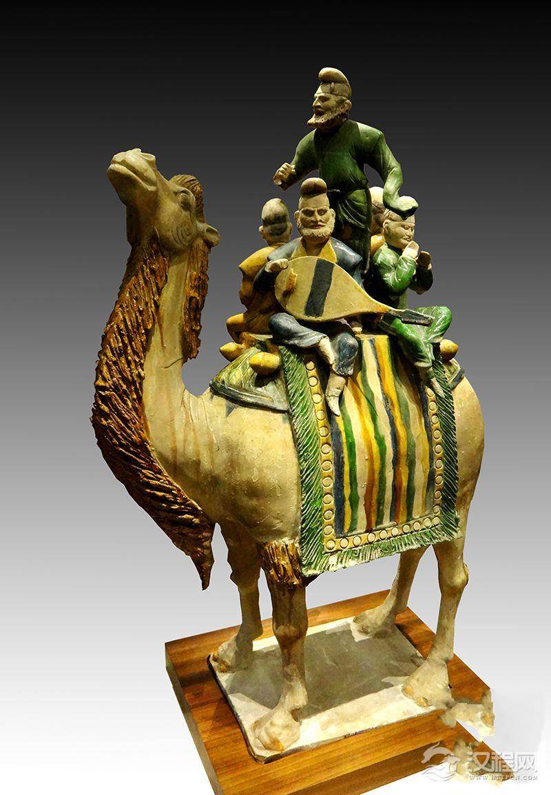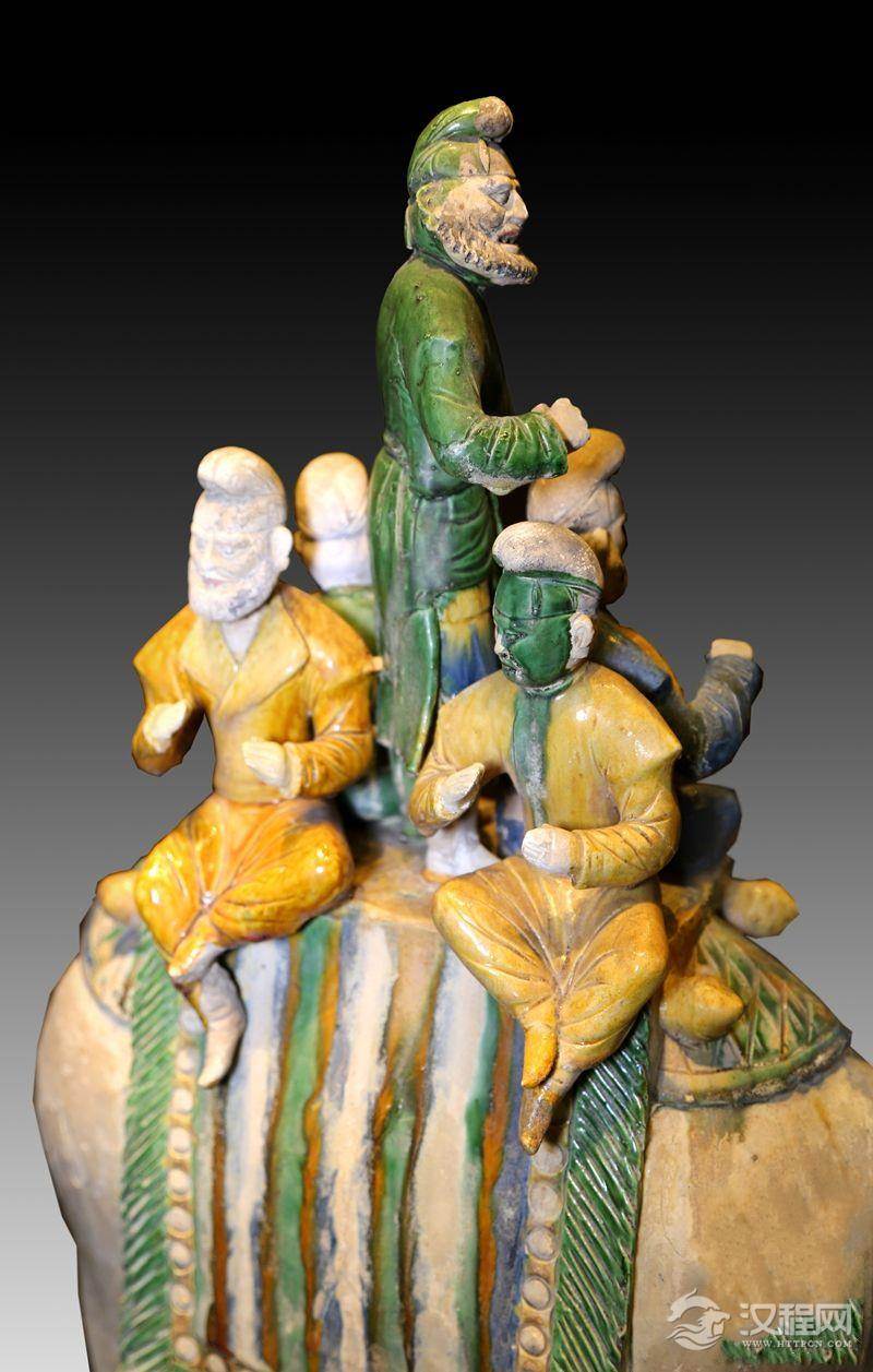 西安是唐朝的京城,又是“丝绸之路”西去的起点,伴随着西亚各国学者、官员、商人、僧尼接踵而来,使得包括胡服、胡乐、胡食、胡用器皿在内的异域文化成为京城风尚。其中,西域乐舞经过唐代艺人的创造,用陶塑表现得活灵活现。在陕西省西安市东郊豁口磨金乡县主墓出土的一套5件男装骑马女乐俑,身着圆领袖长袍,体态丰腴,神情专注,骑于马上作演奏状,分别手持用箜篌、琵琶、腰鼓、筚篥、铜钹演奏。此外,1957年陕西省西安市唐右领军卫大将军鲜于庭诲墓出土三彩骆驼载乐俑。在骆驼背驮载的平台上载有一绿袍高歌欢唱、合乐而舞的胡人,周围坐有四位乐俑神情专注奏乐。作品题材新颖,风格独特,型体高大,典型代表了盛唐社会风俗及高超艺术成就。