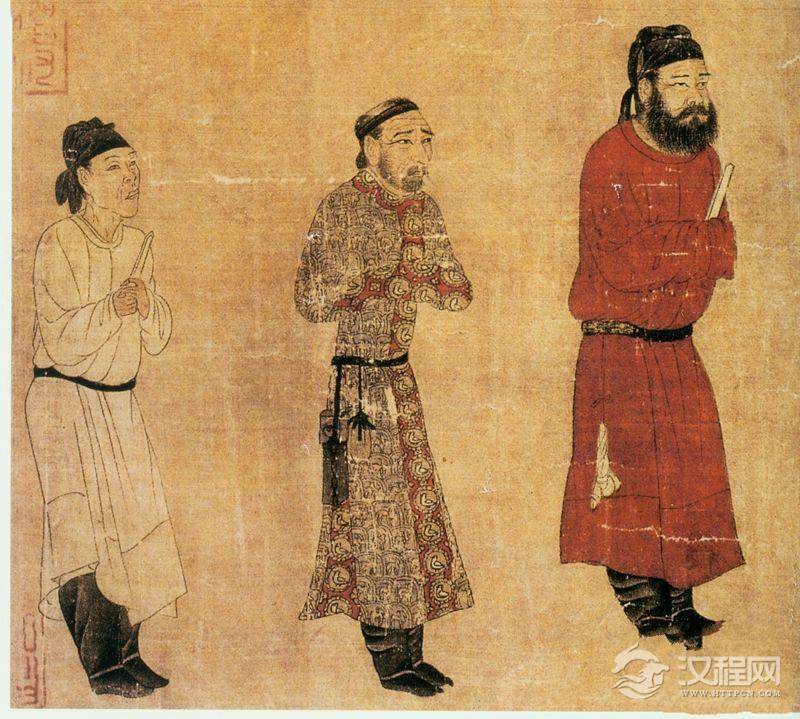 在阎立本绘《步辇图》中就绘有身穿常服圆领袍的唐太宗形象。画中男子除吐番使者外,都着幞头圆领袍,连皇帝也不例外。圆领袍亦称团领袍,是隋唐时期士庶、官宦男子普遍着装的服式,除祭祝典礼之外,平常均可穿之。因为圆领衫在唐代属于常服,所以各阶层都常穿常见。《步辇图》画的是贞观十五年(公元641年),吐番丞相禄东赞前往京都长安,迎文成公主入藏,受到唐太宗接见的历史故事。画面右侧坐在步辇上的是唐太宗。左侧站立三人,绯色和白色圆领袍的下摆处均有一横襕,可称之为襕衫,乃古代士人之服。其制始于北周。于唐代使用渐多。宋时,进士及国子生、州县生服之。