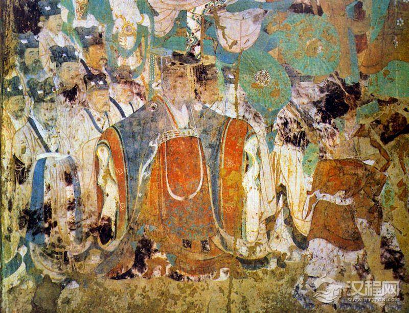 敦煌莫高窟220窟唐贞观时期壁画维摩诘说法图身穿冕服的唐代帝王像。
